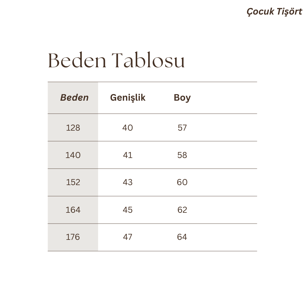 Beden: 128(9-10 Yaş)-140(10-11 Yaş)-152(11-12 Yaş)-164(12-13 Yaş)-176(13-14 Yaş)